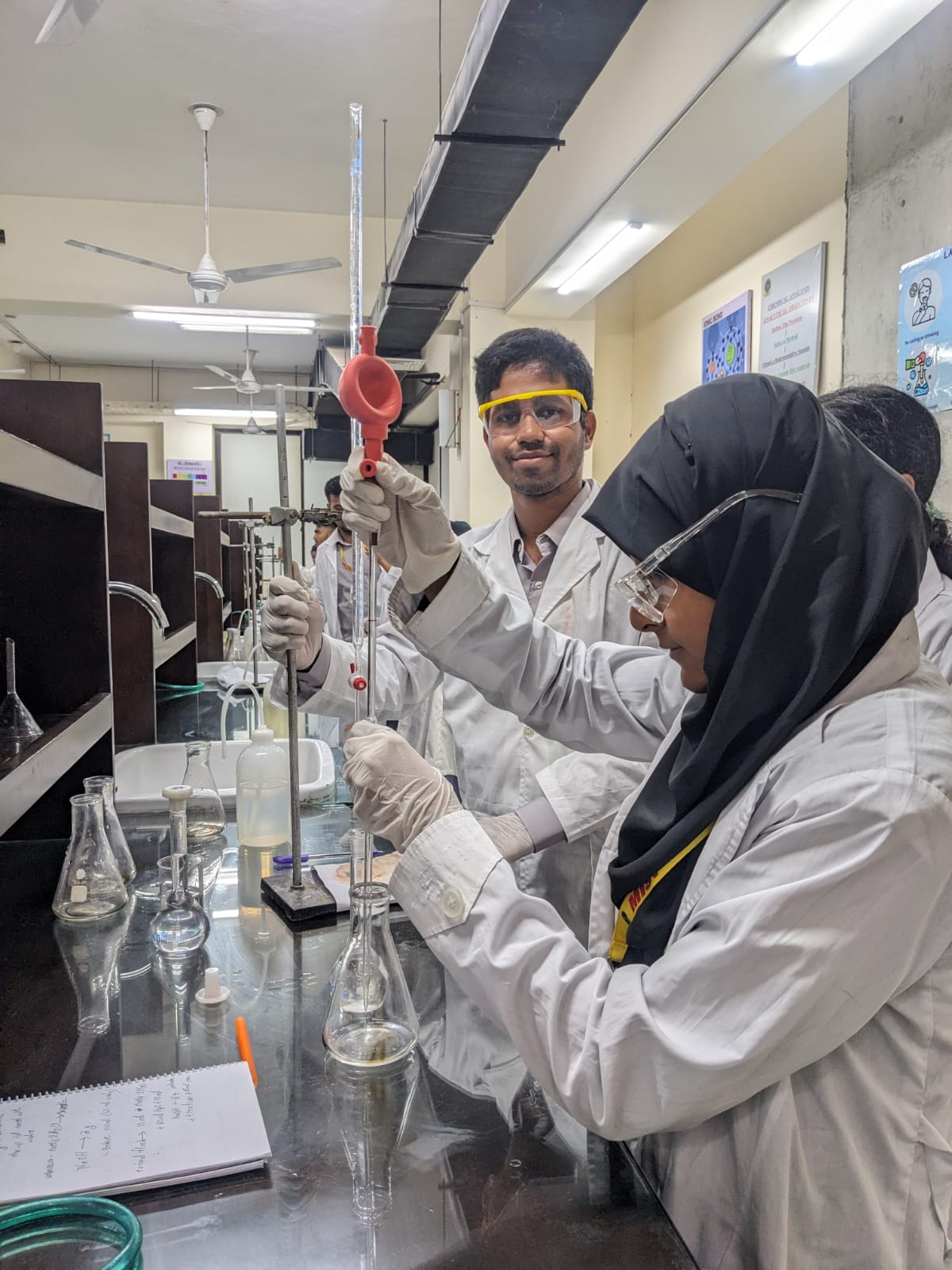 Chemistry Laboratory for Undergraduate Engineering Students at MIST is a spacious and well-equipped facility covering a total area of 4,800 ft², with a student capacity of 50 per session. The laboratory is supported by three lab assistants, one technician, and one lab attendant to ensure smooth, safe, and effective operations. It houses 38 essential pieces of equipment for instructional and analytical purposes. At Level 1 of the chemistry course, students actively participate in hands-on experiments involving basic quantitative inorganic analysis, solution preparation, and titrimetric techniques. Typical student activities include standardization of solutions, determination of metal ions, and analysis of water and simple inorganic samples. The laboratory is further equipped with a UV–V is spectrophotometer, oven, mechanical shaker, and a complete distillation setup, along with a wide range of chemicals. The mission and vision of the laboratory are to familiarize students with fundamental quantitative characterization techniques, enabling them to understand the sophisticated chemistry underlying their core engineering subject concepts.
