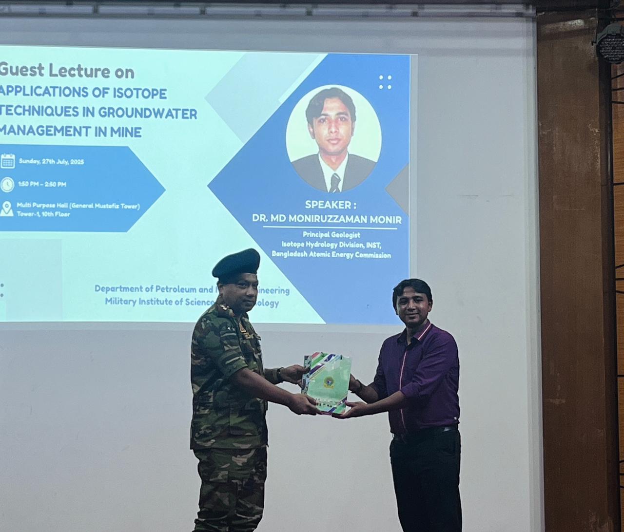 The Department of Petroleum and Mining Engineering (PME), MIST organized a guest lecture on “Application of Isotope Techniques in Groundwater Management in Mines” on 27 July 2025. The session was conducted by Dr. Md. Moniruzzaman Monir, Principal Geologist, Bangladesh Atomic Energy Commission.
