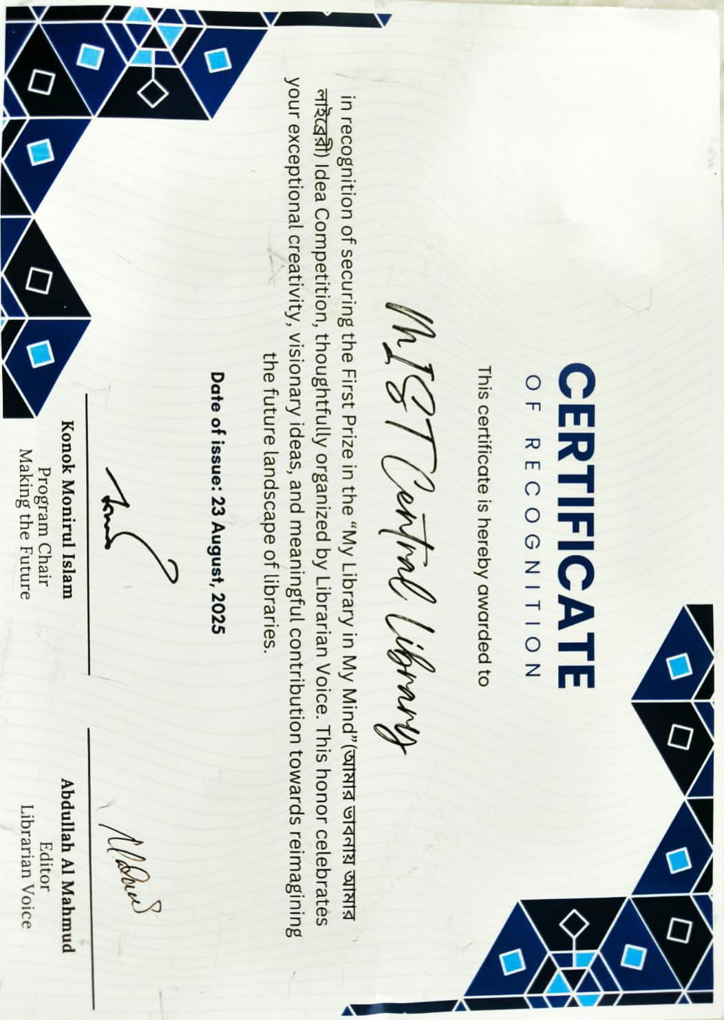 We are thrilled to announce that MIST Central Library has been awarded the First Prize in the "My Library in My Mind" Idea Competition. Organized by Librarian Voice, this honor recognizes our commitment to exceptional creativity and our meaningful contribution towards reimagining the future of libraries.